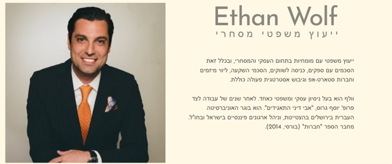 איתן וולף - ייעוץ משפטי ועסקי. וולף הוא מחבר הספר "חברות" בהוצאת בורסי (2014). לשעבר מנכ"ל חברת ביטוח בינלאומית באירופה וממייסדי חטיבת החדשנות והדיגיטל של בנק הפועלים ("ביט"). מומחה בהסכמים מסחריים, אסטרטגיות חדירה לשווקים בארץ ובחו"ל ותהליכי מיתוג וניהול.